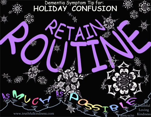* Admin issues: SHARE dementia awareness thru buttons below. Feel free to leave your thoughts in the form of comments, but please filter your comments with truthful loving kindness to all concerned. If interested in receiving notice of future blog postings, subscriptions are available through a “follow” button in the upper left corner (MS Explorer) or lower right (Safari, Mozilla Firefox and Chrome). If there is an advertisement below, I have no control over what is shown. My own full legal name is Truthful Loving Kindness. My current clinical diagnosis is Mild Cognitive Impairment. Text for this page took 1 hour over 3 days, but graphic required 14 hours. Tags: alzheimers, dementia, holiday, person with dementia, PLwD, relationship, routine, symptoms . S&S: holiday .