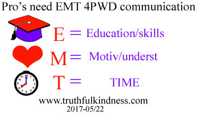 * Admin issues: SHARE dementia awareness thru buttons below. Feel free to leave your thoughts in the form of comments, but please filter your comments with truthful loving kindness to all concerned. If interested in receiving notice of future blog postings, subscriptions are available through a “follow” button in the upper left corner (MS Explorer) or lower right (Safari, Mozilla Firefox and Chrome). If there is an advertisement below, I have no control over what is shown. My own full legal name is Truthful Loving Kindness. With the new terminology my current diagnosis is Mild Cognitive Impairment, but my neurologist said I am in a unique position for helping because I have “one foot in each door”. Copyright 2017-05/22. Tags are dementia, communication, professionals, research, and partnership.