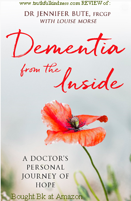 * Admin issues: SHARE dementia awareness thru buttons below. Feel free to leave your thoughts in the form of comments, but please filter your comments with truthful loving kindness to all concerned. If interested in receiving notice of future blog postings, subscriptions are available through a “follow” button in the upper left corner (MS Explorer) or lower right (Safari, Mozilla Firefox and Chrome). If there is an advertisement below, I have no control over what is shown. My own full legal name is Truthful Loving Kindness. My current diagnosis is still Mild Cognitive Impairment, but my neurologist said I am in a unique position for helping because I have “one foot in each door”. Text Copyright © Truthful L. Kindness 2019Jan14 (altho Jennifer has copyright for all quotes on this page). Tags are: book, dementia, Jennifer Bute, PLwD, strategy, symptom.