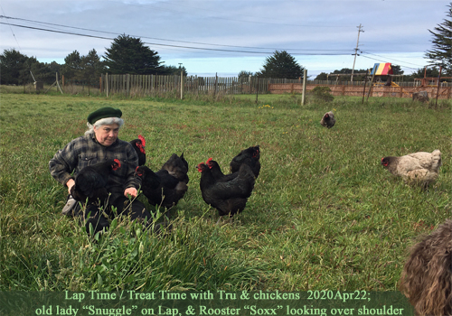* Admin issues: SHARE dementia awareness thru buttons below. Feel free to leave your thoughts in the form of comments, but please filter your comments with truthful loving kindness to all concerned. If interested in receiving notice of future blog postings, subscriptions are available through a “follow” button in the upper left corner (MS Explorer) or lower right (Safari, Mozilla Firefox and Chrome). If there is an advertisement below, I have no control over what is shown. My own full legal name is Truthful Loving Kindness. My current diagnosis is still Mild Cognitive Impairment, but my neurologist said I am in a unique position for helping because I have “one foot in each door”. Text Copyright © Truthful L. Kindness 27Apr2020. Tags are: animal, chicken, dementia, hen, henpower, therapy