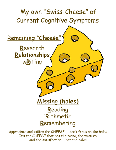 — you get the point: FOCUS on the remaining cheese, instead of the “holes” which have our DYS-abilities. (But in order to retain that focus, we need to have already strategized for ways to handle the dys-abling parts of living life.)