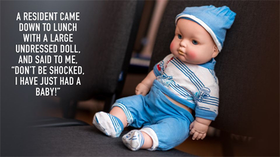 Often for a person with advanced dementia a doll can provide solace and purpose, reduce agitation and sadness, and be of great benefit. Just as any ‘therapy’ aims to be, such as pets, gardening, music, cooking, painting, and interacting with preschool children – so why not dolls?