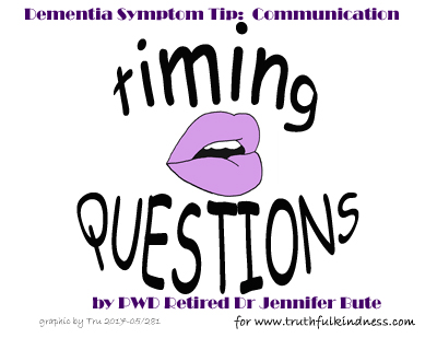 * Admin issues: SHARE dementia awareness thru buttons below. If interested in receiving notice of future blog postings there is a “follow” button in the upper left corner (MS Explorer) or lower right (Safari and Chrome). Feel free to leave your thoughts in the form of comments, but please filter your comments with truthful loving kindness to all concerned. If there is an advertisement below, I have no control over what is shown. — Copyright exclusively by Jennifer Bute on 2017-05/25 (( but if there is font detail like bold and underlining, it is Truthful’s doing in order to easily find quotes in the future )) Tags: Jennifer Bute, dementia, communication, dementia relationship tips