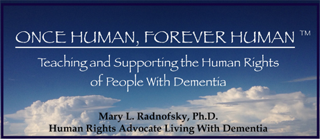 * Admin issues: SHARE dementia awareness thru buttons below. Feel free to leave your thoughts in the form of comments, but please filter your comments with truthful loving kindness to all concerned. If interested in receiving notice of future blog postings, subscriptions are available through a “follow” button in the upper left corner (MS Explorer) or lower right (Safari, Mozilla Firefox and Chrome). If there is an advertisement below, I have no control over what is shown. Copyright for all above entries exclusively by Mary Radnofsky. Tags are: dementia, human rights, Mary Radnofsky, PLwD, subcortical leukoencephalopathy.