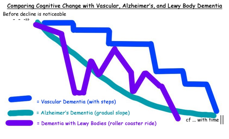 2019Apr12 Robert included this graphic with “Comparing path of Alzheimer’s, Vascular Dementis, Dementia with Lewy Bodies. Alzheimer’s tends to be a downward curve. Vascular Dementia tends to decline stepwise. Dementia with Lewy Body Bodies tends to be an unpredictable roller coaster ride.” — Robert Bowles on 12Apr2019.